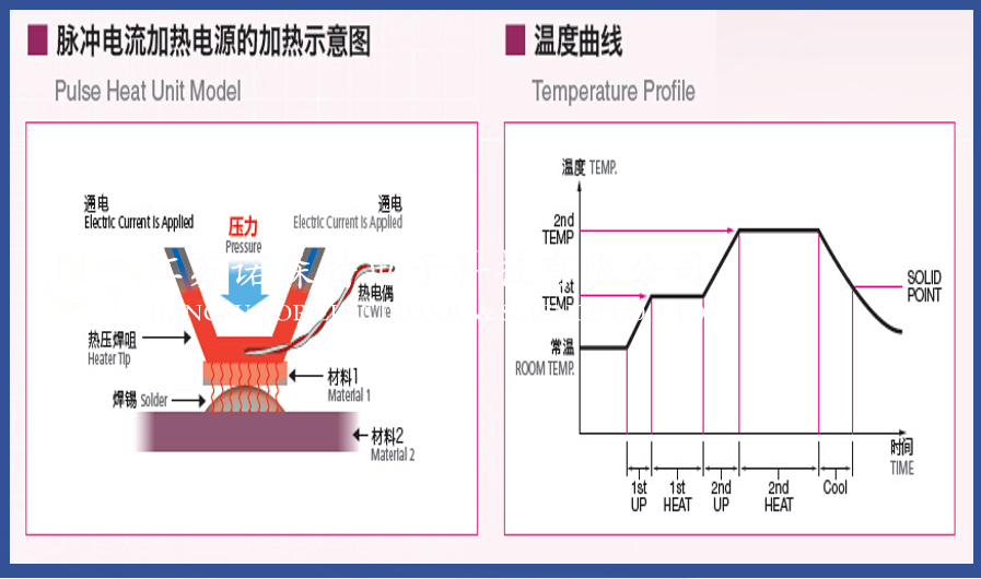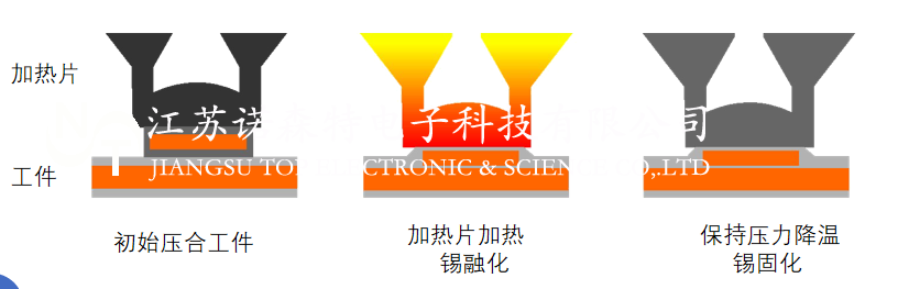 通過程序控制電源放電使專用的熱壓頭產生焦耳熱,達到設定的溫度。通過施加一定的壓力使熱壓頭與工件焊接部位充分接觸,傳導一定的熱量使工件錫層融化,然后保壓快速降溫,達到錫層固化連接。
