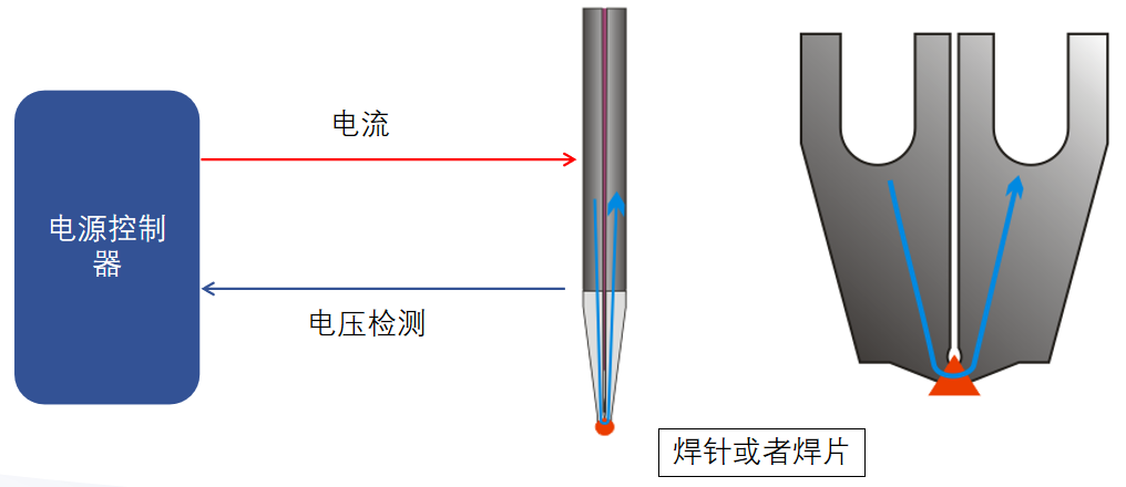 通過程序設定控制電源的電流和時間使專用的焊頭局部產生焦耳熱,達到短時高溫。同時使焊頭與焊接部位壓力接觸并傳導熱量給焊接部位,使焊接部位受熱達到焊接的目的。