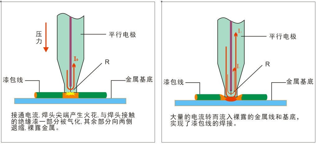 這種焊接方式叫微點焊漆包線焊接工藝,適合細小漆包線(直徑;0.3mm內)的不去漆焊接,如果漆包線太粗,則焊接需要的熱量是非常大,用于微點焊工藝的焊頭發熱是有極限可能會滿足不了,無法達到焊接效果。如果漆包線線徑較大,有兩種工藝:一是可以去皮再焊接。另一種工藝: 不想多一道去工序直接焊接,也可以實現,只是這種焊接工藝就不能適用了。較大線徑、面積漆包線焊接工藝屬于熱熔焊接。